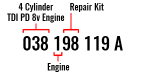 A repair kit contains the parts needed for a specific repair (a brake pad set, cambelt / timing belt kit, or a hose repair set). Brake pads, for example, always come in axle sets, as they should always replaced this way. The middle three digits of a repair kit part number can help identify it, as shown in the following example:
