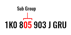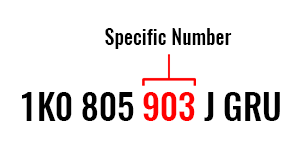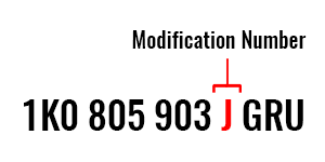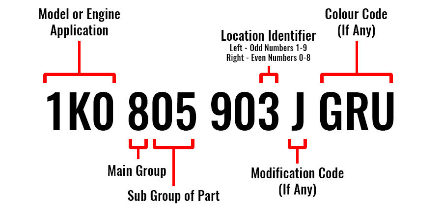 The basic part number structure normally has nine characters. In many cases, additional suffix characters are added to indicate special part characteristics such as colour, design variations, etc. Even though sometimes part numbers are written without spaces, for example, 1K0805903JGRU - a Mk5 Golf Front Splitter / Spoiler. It helps to think of it as several groups of characters: 1K0 805 903 J GRU. The graphic below shows how the number is built and how to interpret the groups of numbers/letters.