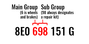 This example is a brake pad set for an Amarok 2010 - 2018 (2H chassis). Whenever the Subgroup – the fifth and sixth digits of the part number sequence is 98, it means the part is a repair kit or set. The Subgroup 98 applies to all Main Groups 1–10. Bare in mind not all Kits / Sets have 98 in the part number. Another example: