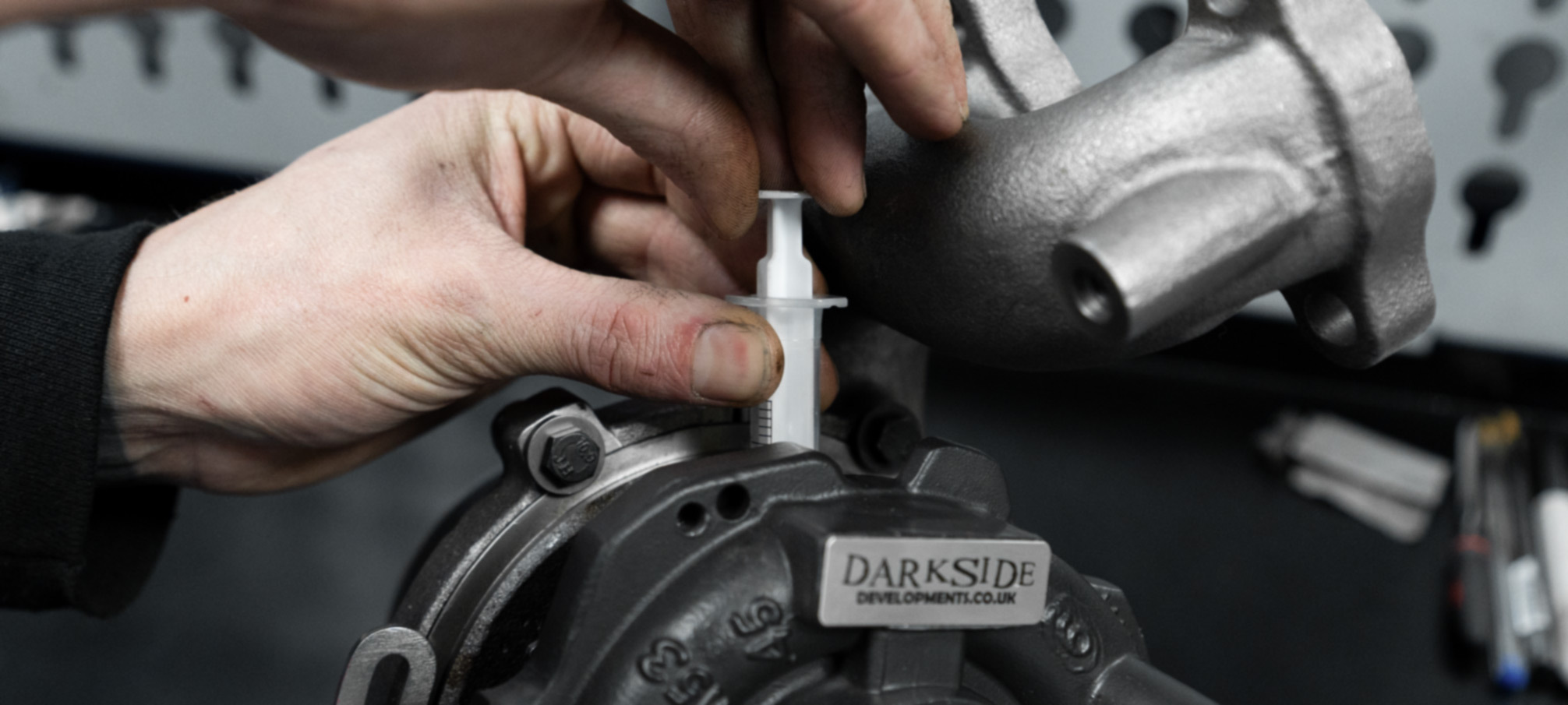 - Use the provided syringe or pour a small amount of fresh engine oil directly into the oil feed port of the turbo.